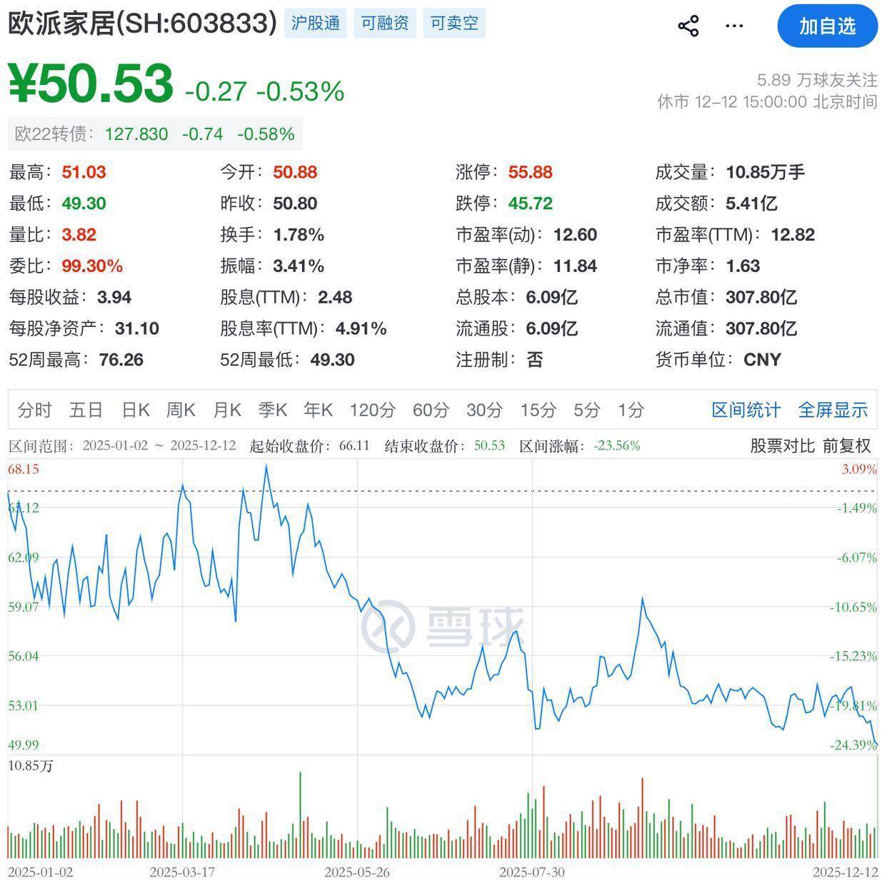 二级市场上,截至12月12日收盘,欧派家居下跌0.53%报50.53元/股,盘中最低至49.30元/股,创年内新低,总市值约307.80亿元。