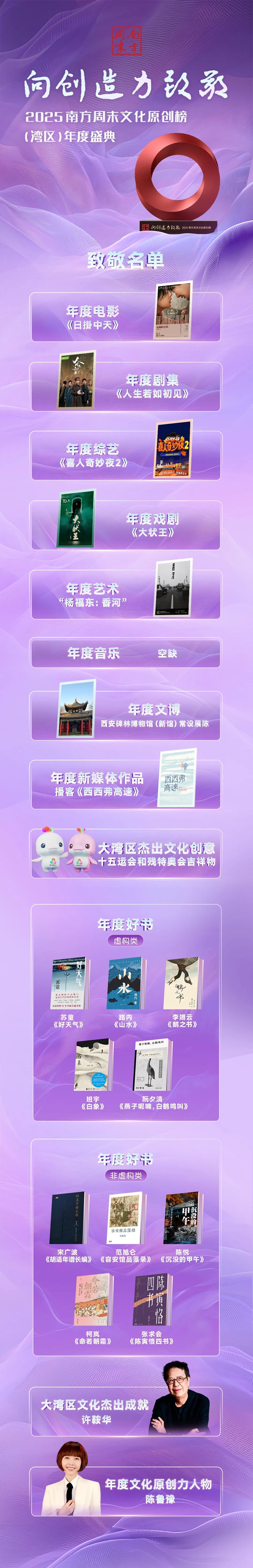 “年度文化原创力人物”荣誉授予媒体人陈鲁豫。30年主持生涯跨越电视、网络视频、播客等多种媒介形式,并探索从“访问者”向“表达者”的转变。2025年推出的视频播客《陈鲁豫·慢谈》,以每期120分钟长时对话,回归深度交流。