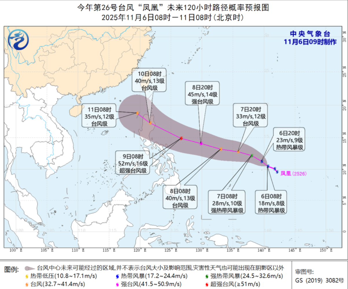 从目前中央气象台公布的台风路径概率预报图看,“凤凰”最强可达强台风级(15级),将登陆菲律宾,随后继续于11日进入南海。